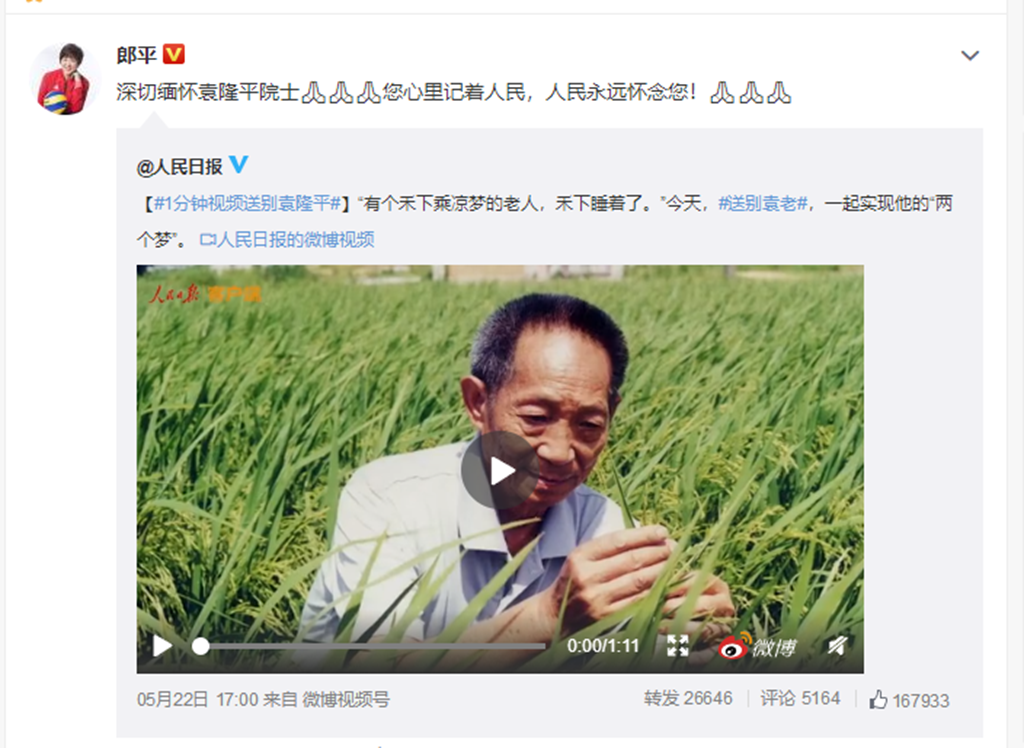 袁隆平逝世以后,不少体坛名宿和运动员表达了哀思。他最喜欢的郎平指导22日晚上在微博上写道:深切缅怀袁隆平院士。您心里记着人民,人民永远怀念您。乒乓球奥运冠军邓亚萍写道:送别袁老,您一路走好。游泳名将傅园慧也在微博上写道:谢谢袁爷爷让我们都能吃饱饭,爷爷走好。自由搏击女将张伟丽则用国士无双来评价袁隆平院士。