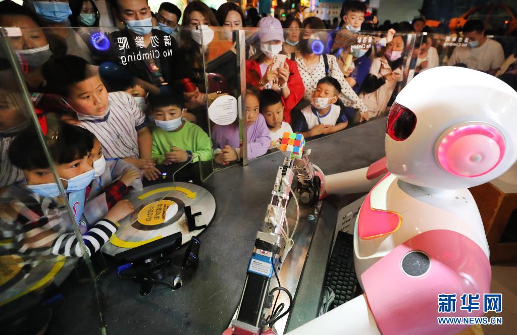 5月23日,小朋友们在观看机器人玩魔方。