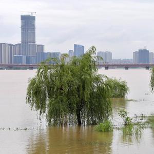 在赣江南昌段,由于水位上涨,一些树木泡在水里(5月23日摄)。