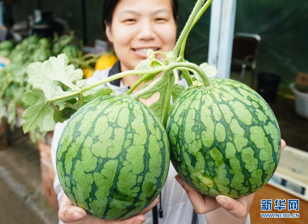 5月23日,在南京市江宁区横溪街道,瓜农在展示西瓜。
