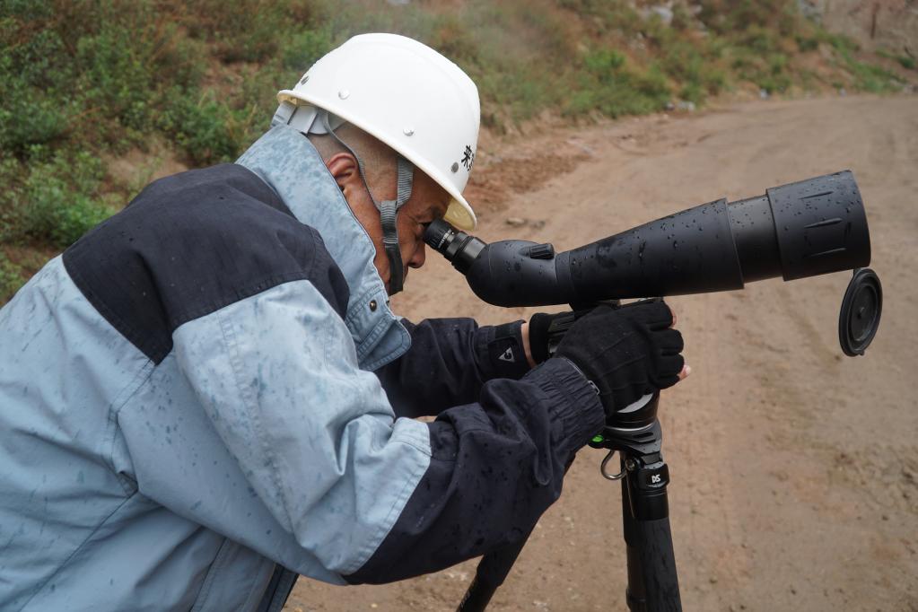 2021年5月22日,在青海省海东市平安区,王舰艇正在用望远镜观察远处的黑鹳。 新华社记者 严赋憬 摄