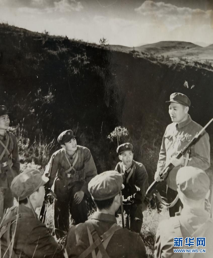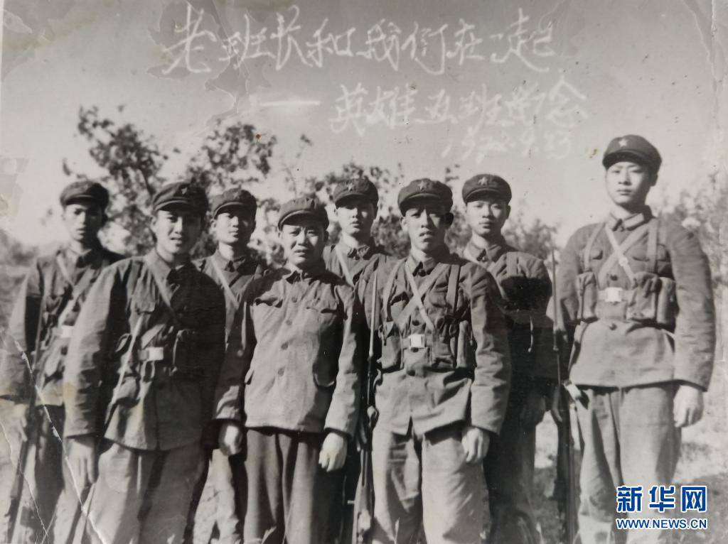 1972年9月23日,胡传久(站者)回三连(松骨峰特功连)驻地与战士们合影。新华社发