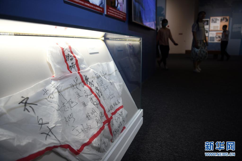 这是展出的首批国家中医医疗队全体队员签名的防护服(5月24日摄)。新华社记者 金良快 摄