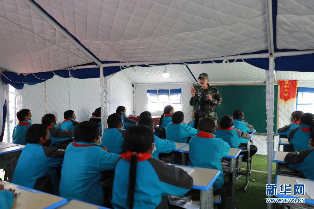 5月24日,武警青海总队果洛支队机动大队排长张国睿为花石峡镇藏文中心寄宿制小学的孩子上课。新华社记者 刘芳 摄