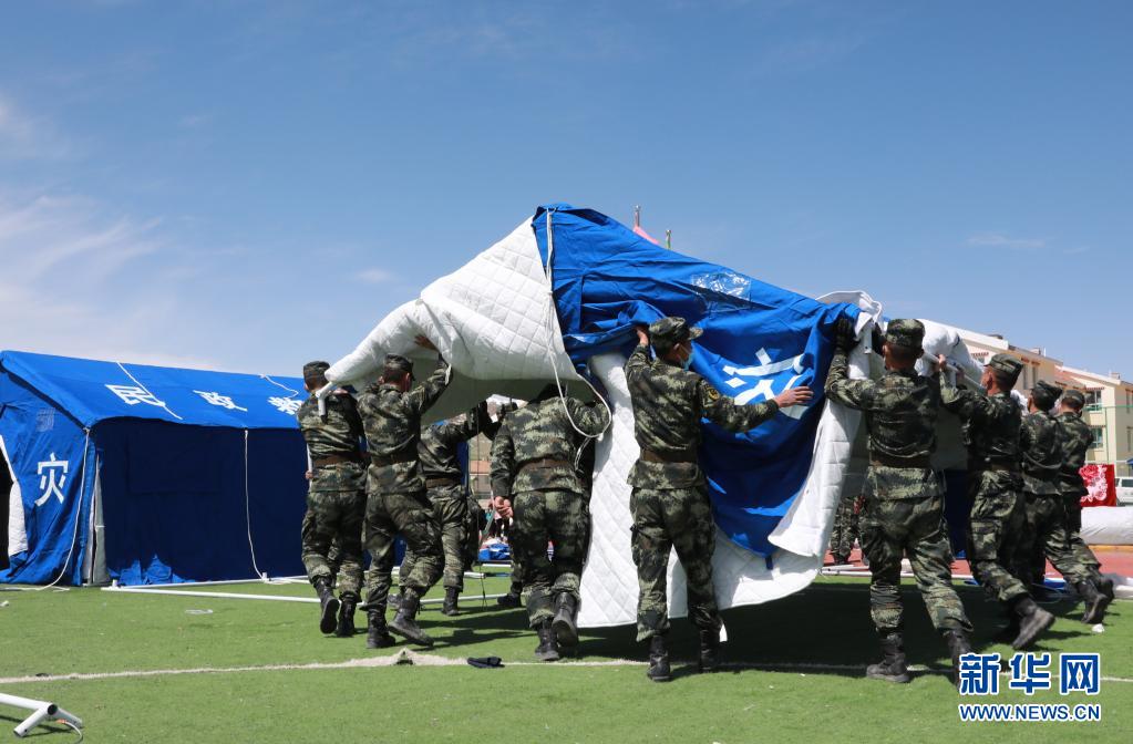5月24日,武警青海总队果洛支队机动大队官兵为花石峡镇藏文中心寄宿制小学搭建帐篷教室。新华社记者 刘新 摄