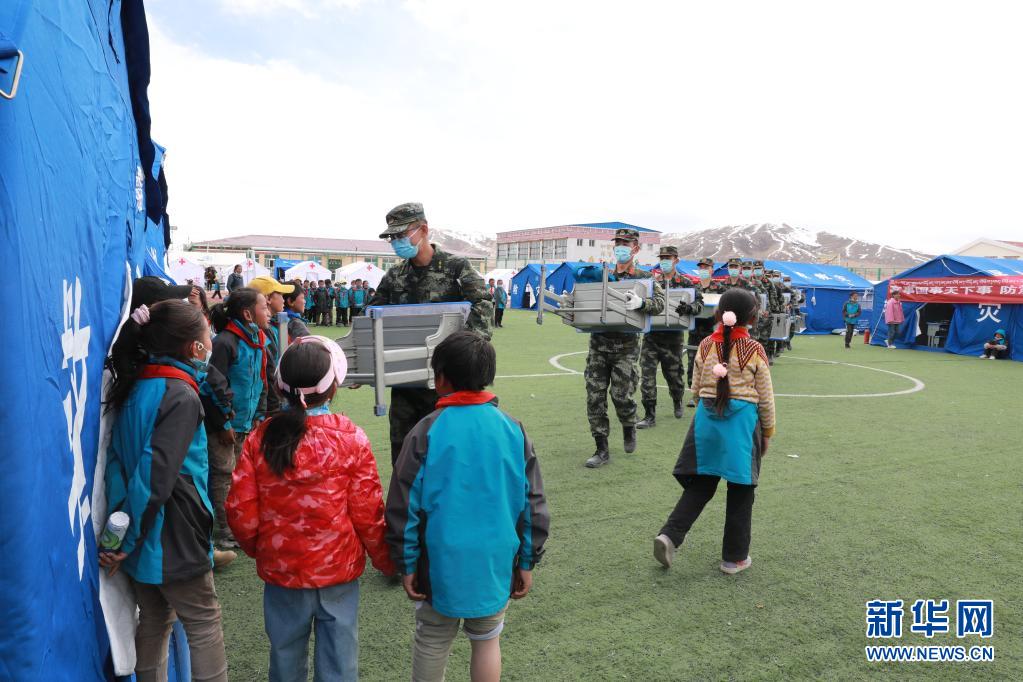 5月24日,武警青海总队果洛支队机动大队排长张国睿(前一)和战友为花石峡镇藏文中心寄宿制小学的帐篷教室搬运课桌。新华社记者 刘芳 摄