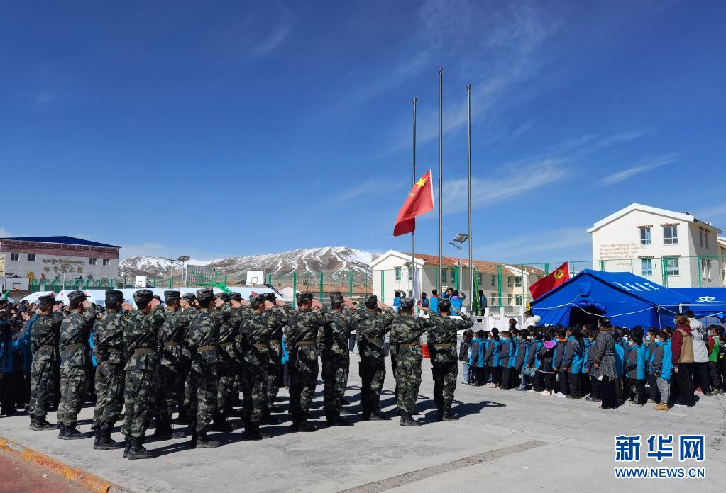 5月24日,武警青海总队果洛支队机动大队官兵与花石峡镇藏文中心寄宿制小学的师生一同参加升国旗仪式。新华社发(宦爵才郎 摄)