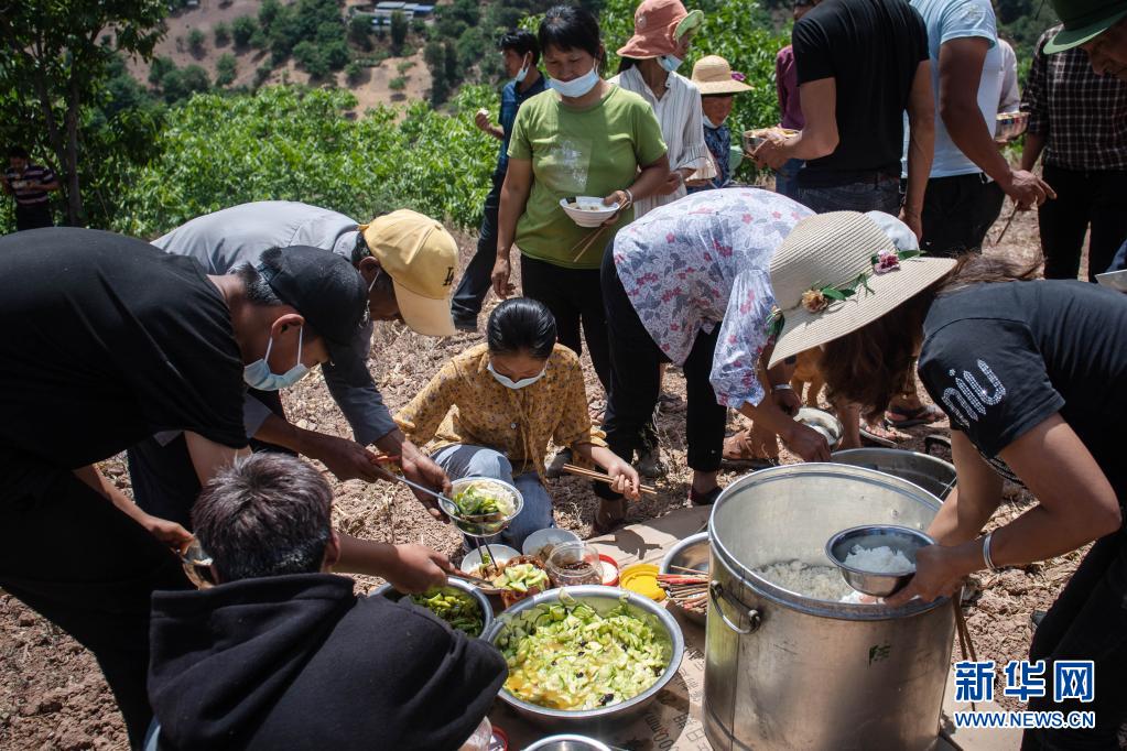 “开饭啦!”中午12时,窦秉金一声吆喝,村民们迅速聚拢过来,排好队依次打饭。红烧肉、炖豆腐、炒小瓜、虎皮青椒……荤素搭配,芳香四溢。盛上香喷喷的米饭,打上喜欢的菜,大家走到旁边树荫下,大口吃起来。