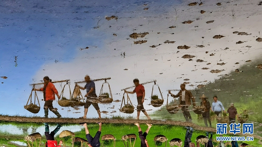 5月22日,水倒影中,安徽省旌德县白地镇汪村岭下组农民行走在田间。