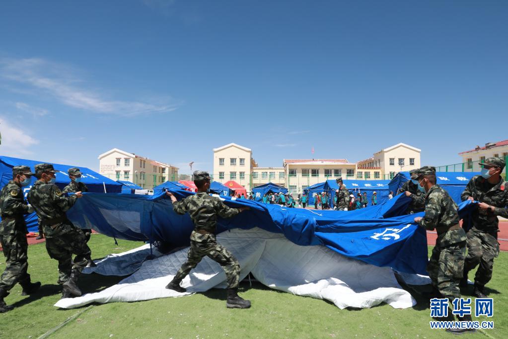 5月24日,武警青海总队果洛支队机动大队官兵为花石峡镇藏文中心寄宿制小学搭建帐篷教室。新华社记者 刘芳 摄