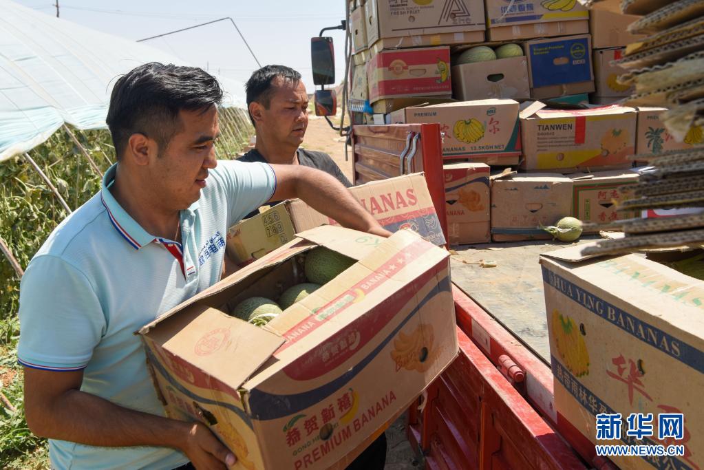 在新疆吐鲁番市高昌区火焰山镇,艾贝都拉·吾木尔(左)将收购的哈密瓜装车(5月20日摄)。新华社记者 丁磊 摄