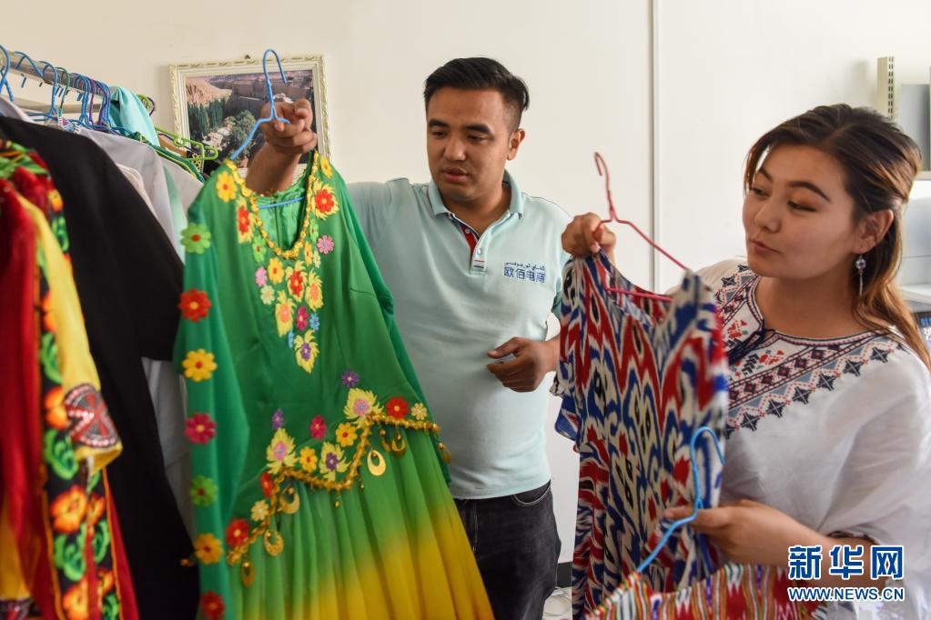 在吐鲁番市欧佰电子商务有限公司,艾贝都拉·吾木尔(左)帮主播挑选直播时要穿的民族服饰(5月19日摄)。新华社记者 丁磊 摄
