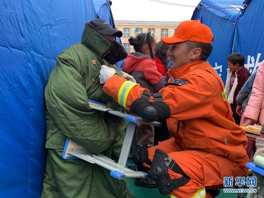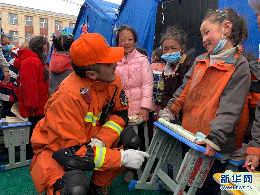 22日,地震发生后,群英尕丁来到安置区搭建帐篷和消防排查,12岁的班玛华桑就与身穿橙色制服的群英尕丁结下了兄弟情谊。“我们是一辈子的兄弟,这几天你也要照顾好自己。”群英尕丁笑着嘱咐班玛华桑。