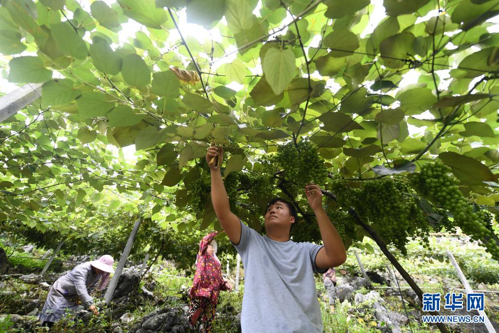 在广西都安瑶族自治县下坳镇隆坝村龙磊屯的毛葡萄示范基地,村民在管护葡萄(2019年7月24日摄)。新华社记者 陆波岸 摄