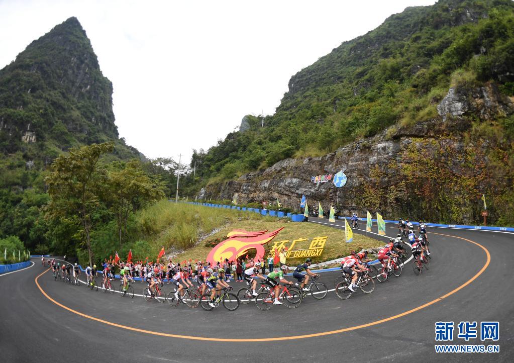 在2017环广西公路自行车世界巡回赛中,参赛选手经过马山县古零镇古零村弄拉屯路段(2017年10月22日摄)。新华社记者 陆波岸 摄