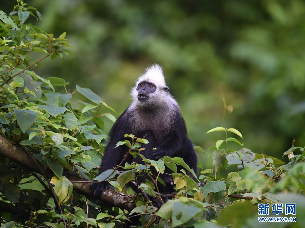 广西崇左白头叶猴国家级自然保护区板利片区一处山坳里,在族群觅食的时候,猴王警惕地观察周围环境(2016年8月6日摄)。新华社记者 周华 摄