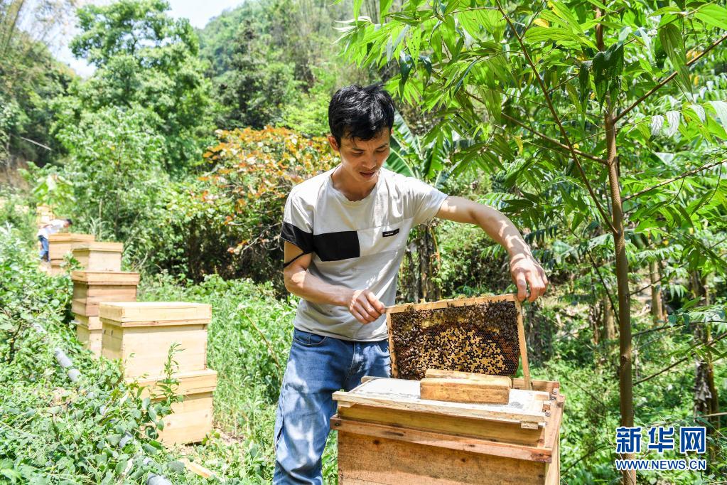 广西百色市乐业县新化镇百坭村村民班华六在查看蜂巢(2020年4月20日摄)。新华社记者 曹祎铭 摄
