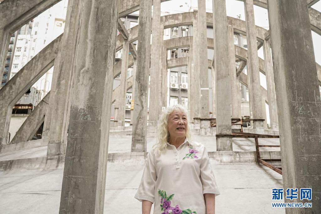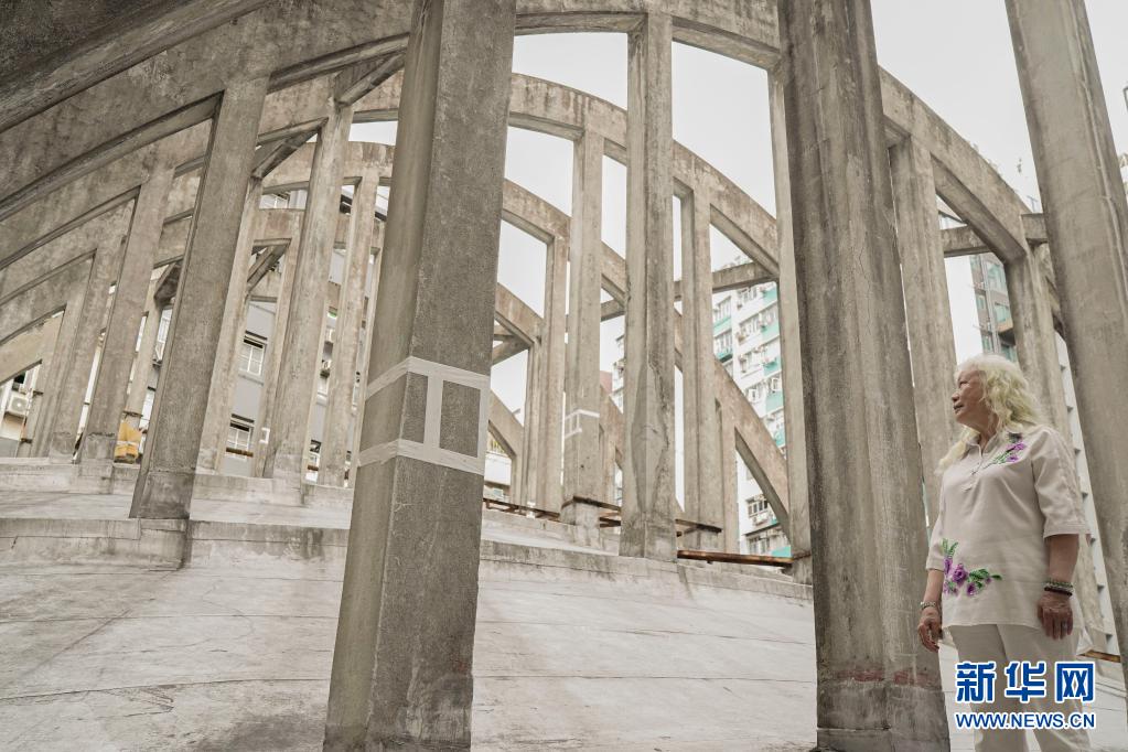 5月6日,香港皇都戏院老员工马淑华在参观戏院楼顶上的抛物线型大型飞拱设计。新华社记者 吕小炜 摄