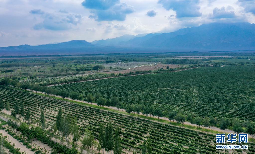 这是贺兰山下的一处葡萄园(2020年7月22日摄,无人机照片)。新华社记者 冯开华 摄