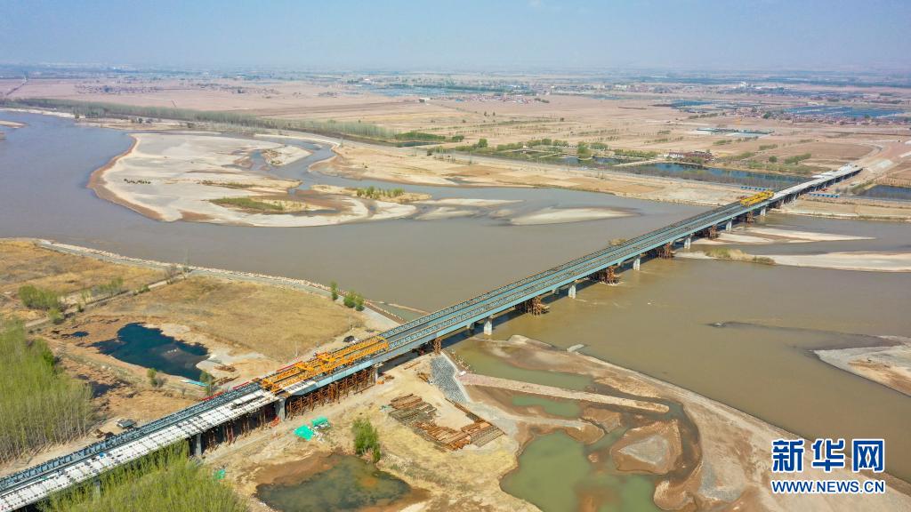 4月11日,乌玛高速公路镇罗黄河特大桥顺利合龙(无人机照片)。新华社记者 冯开华 摄