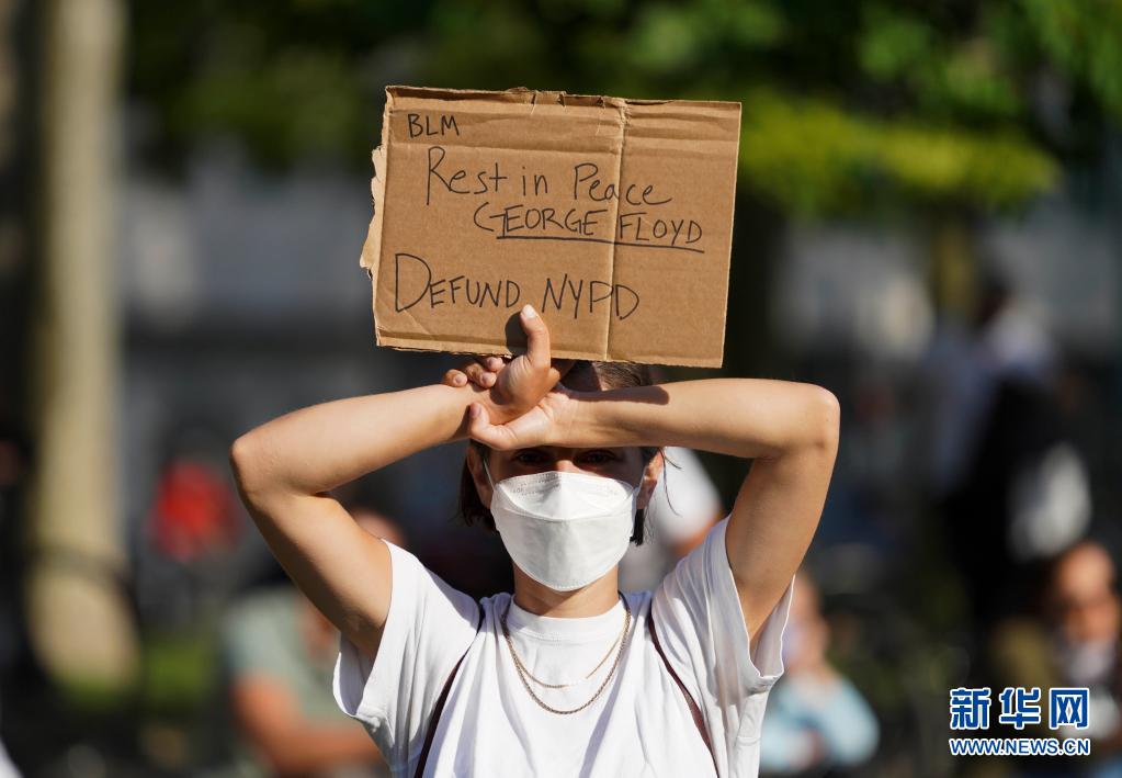 5月25日,一名女子在美国纽约的卡德曼广场公园手举标语牌参加悼念弗洛伊德的集会。新华社记者 王迎 摄