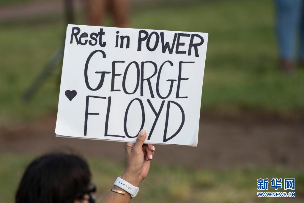 这是5月25日在美国华盛顿白宫附近悼念弗洛伊德的集会上拍摄的标语牌。新华社记者 刘杰 摄