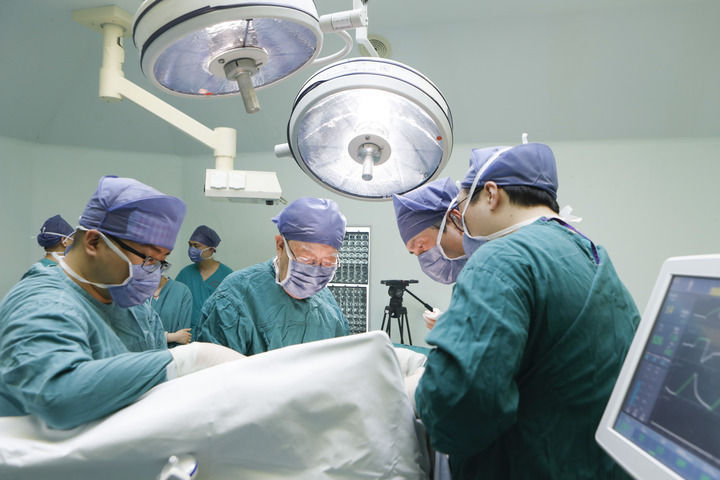 97岁高龄的吴孟超(左二)坚持工作在手术台上(2019年3月15日摄)。新华社发(曹希摄)