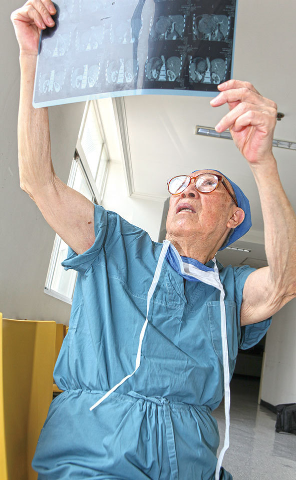 2011年4月13日,年近90的吴孟超在手术后分析患者的核磁共振结果。新华社发(张鹏摄)