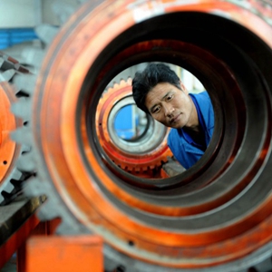 工作人员在河南洛阳中信重工生产车间查看大型矿用磨机。新华社记者朱祥 2010年8月25日摄