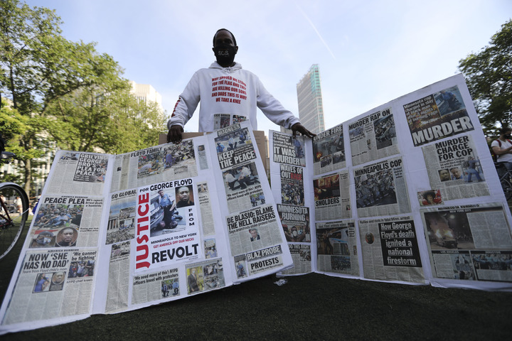 5月25日,一名男子在美国纽约的卡德曼广场公园参加悼念弗洛伊德的集会。新华社记者 王迎 摄
