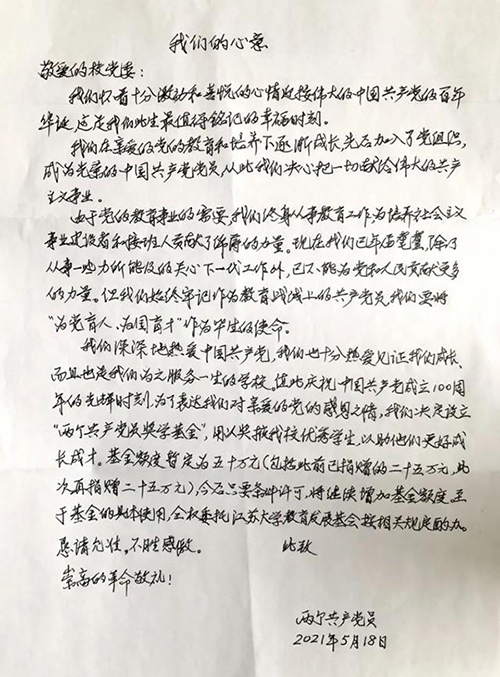 虽已耄耋,初心未变。“两个共产党员”在给校党委的回信中说出了他们的“心意”,“始终牢记,把‘为党育人、为国育才’作为毕生的使命”“今后只要条件许可,将继续增加奖学基金的额度”……字字句句尽显共产党员本色。
