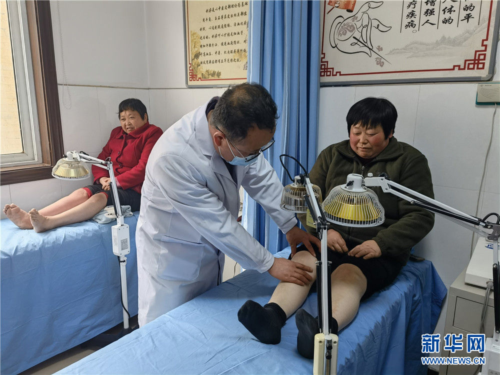 陕西省宝鸡市麟游县崔木镇中心卫生院内,医生为大骨节病患者进行中医理疗(4月6日摄)。 新华社记者 蔺娟 摄