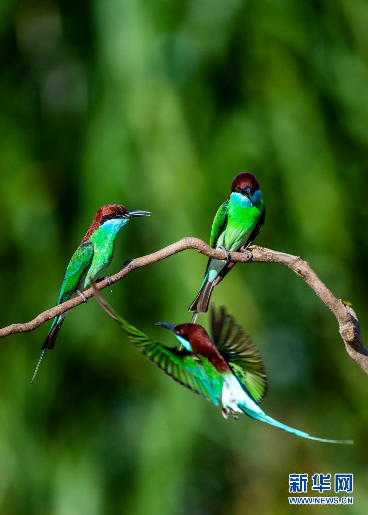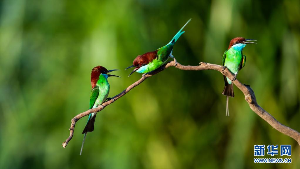 新华社福州5月27日电(记者梅永存、彭张青)立夏以来,一种美丽的小鸟——东南亚蓝喉蜂虎飞临闽北南平市延平区炉下镇斜溪村闽江河谷筑巢,开启一年一度的“蜜月”之旅。
