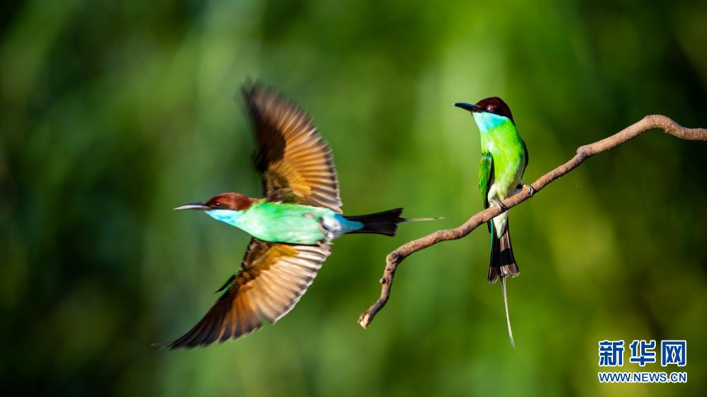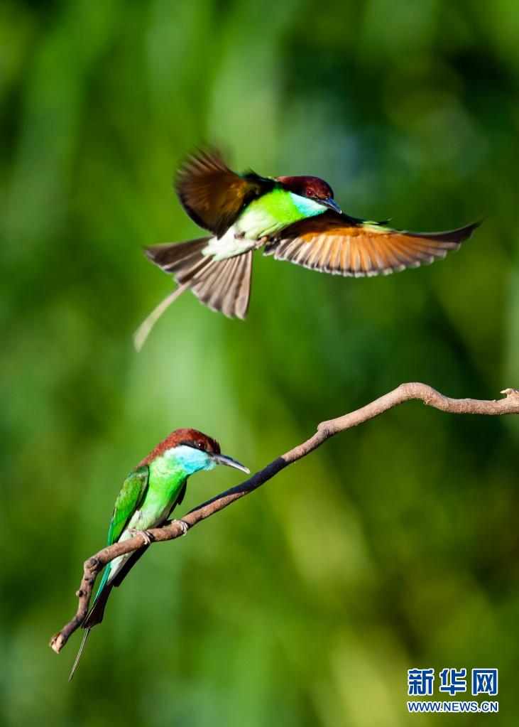 5月26日,蓝喉蜂虎在南平市延平区炉下镇斜溪村闽江河谷嬉戏。新华社记者 彭张青 摄