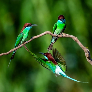 幼鸟出生后不久,就开始离巢学习飞行、捕食技能。深秋时节,蓝喉蜂虎会携家带口返回东南亚越冬。