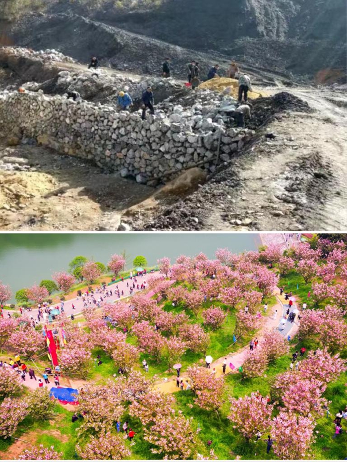 拼版图片:上图,安源区城郊管委会略下村生态修复前矿山裸露;下图,生态修复后“阳光花海”景象。(萍乡市委宣传部供图)