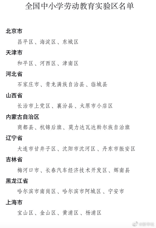 记者27日从教育部官网获悉,教育部办公厅日前下发通知,公布全国中小学劳动教育实验区名单。在自主申报、省级推荐的基础上,经专家评审、综合评定和网上公示,认定北京市昌平区等96个县(区、市)为全国中小学劳动教育实验区。名单见下图。(记者 王鹏)