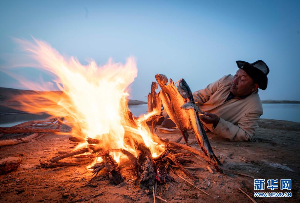 在新疆尉犁县罗布人村寨里,罗布人阿木东·艾不东在塔里木河畔烤鱼(2019年4月11日摄)。新华社记者 赵戈 摄