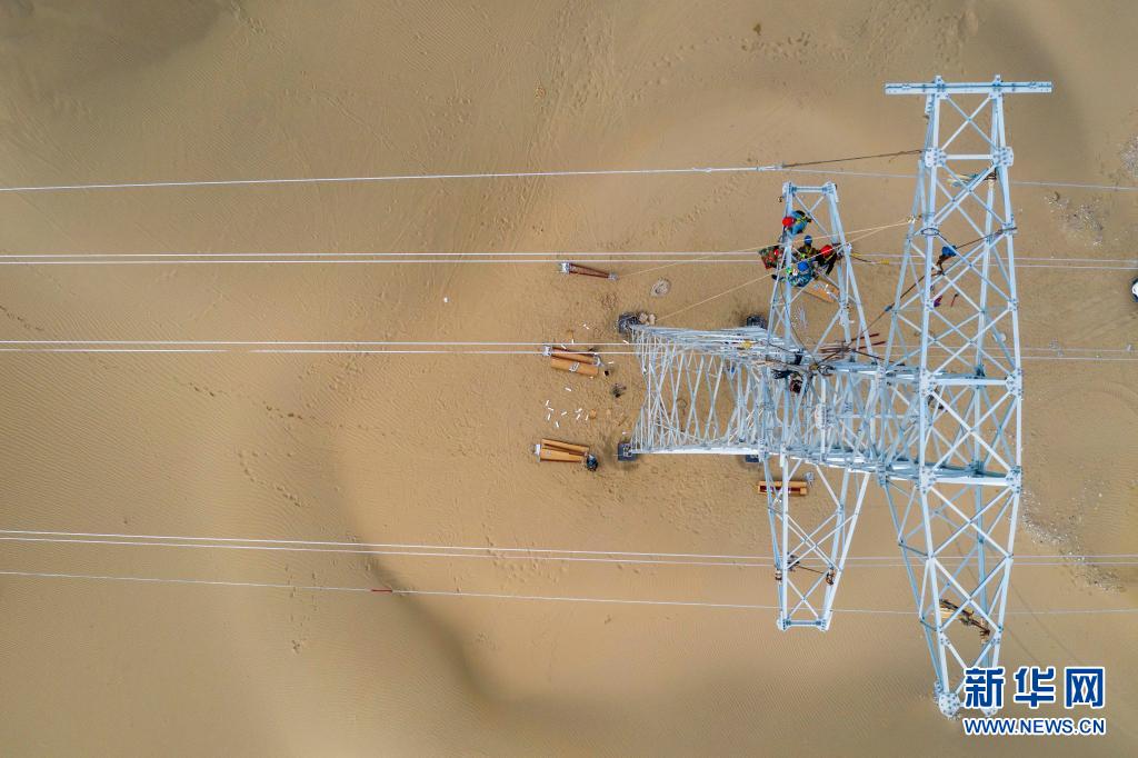在新疆和田地区沙漠中,电力工人在一处铁塔上进行高空作业(2020年9月28日摄,无人机照片)。新华社记者 胡虎虎 摄