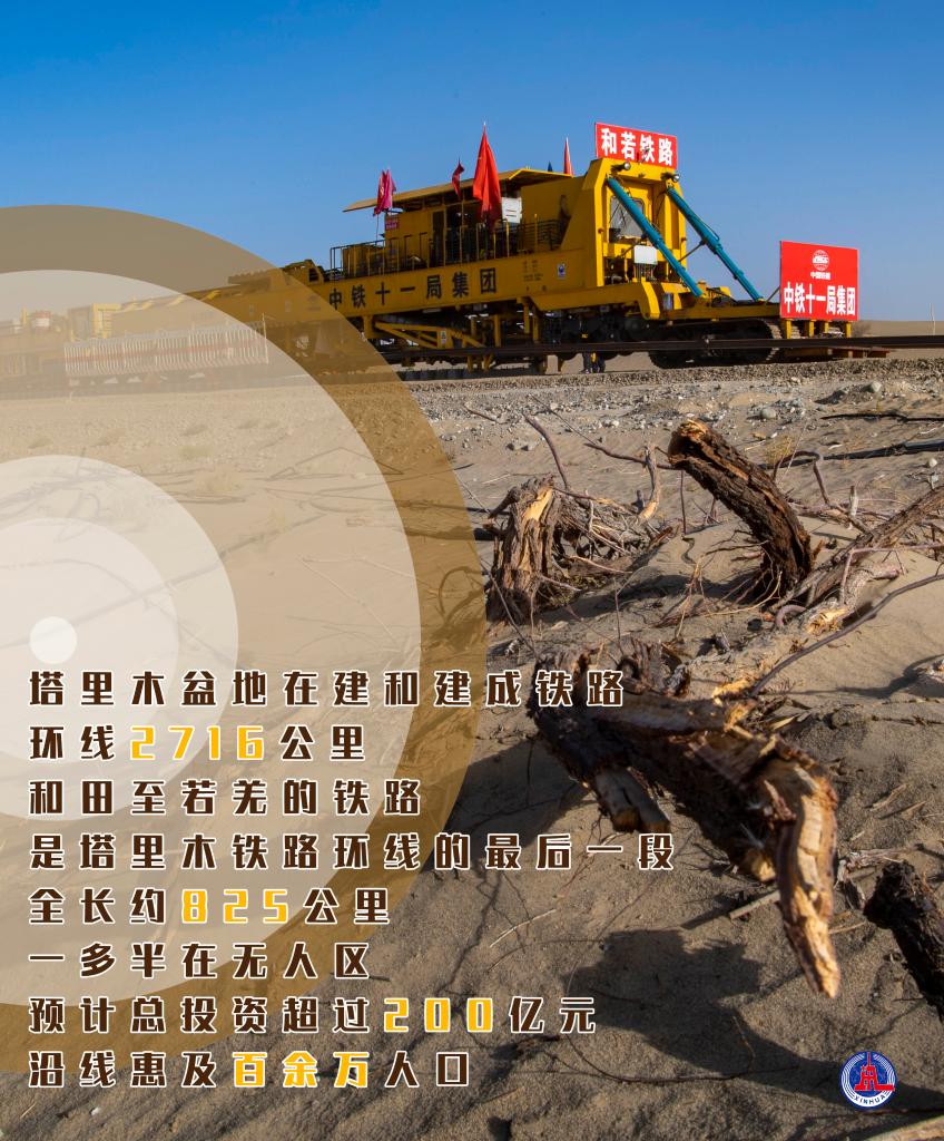 且末,王尽忠顺着正在沙漠里建设的铁路钢轨望向远方。和田至若羌的铁路是塔里木铁路环线的最后一段,全长825公里,一多半在无人区,预计总投资超过200亿元,沿线惠及百余万人口。“为了南疆百姓,再难、再远,我们也要把铁路建起来。”他说。