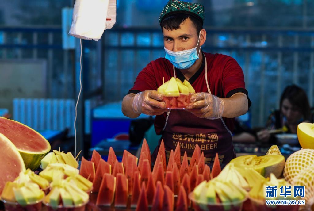 在新疆和田夜市,一商贩展示刚刚切好的瓜果(2020年5月18日摄)。新华社记者 王菲 摄
