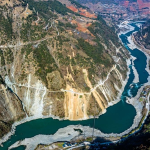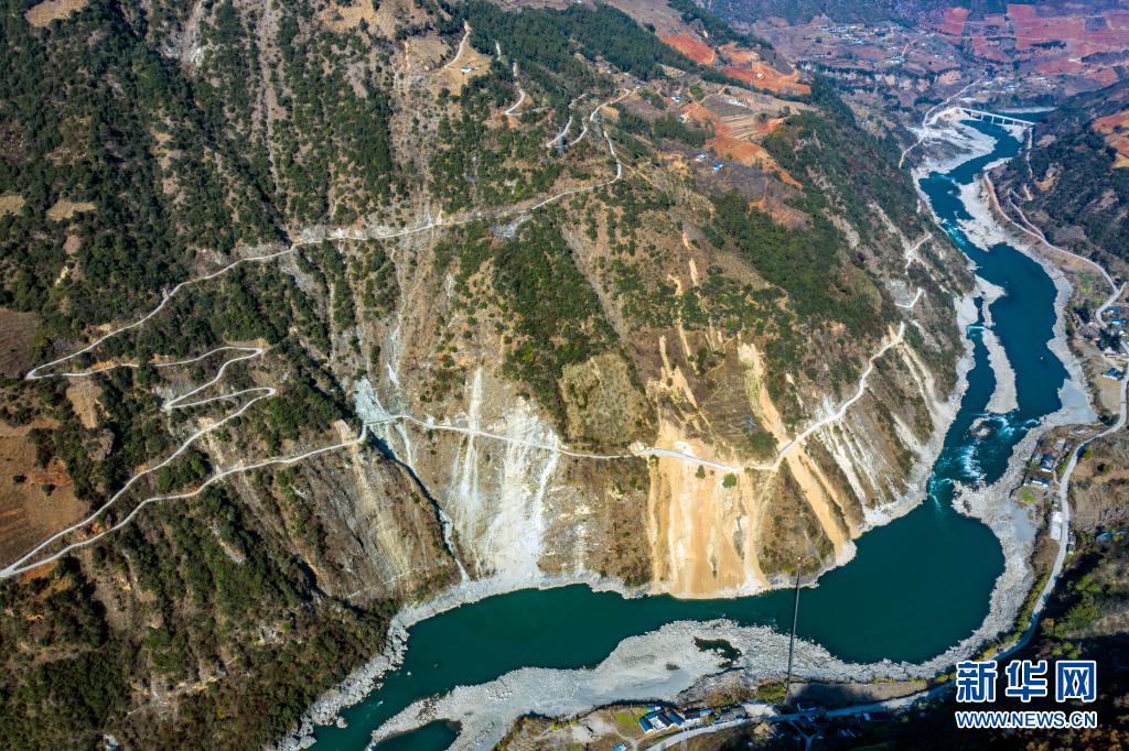 坐落于雅砻江畔悬崖绝壁上的四川省凉山彝族自治州冕宁县全阁村通村路(1月13日摄,无人机照片)。如今村民们待在家里就能把地瓜、青花椒卖给开车上山的商贩。新华社记者 沈伯韩 摄
