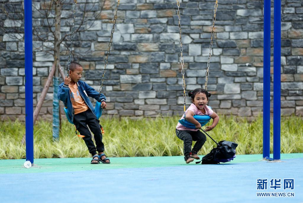 在四川省凉山彝族自治州昭觉县易地扶贫搬迁安置点南坪社区,孩子在玩秋千(2020年8月12日摄)。新华社记者 沈伯韩 摄