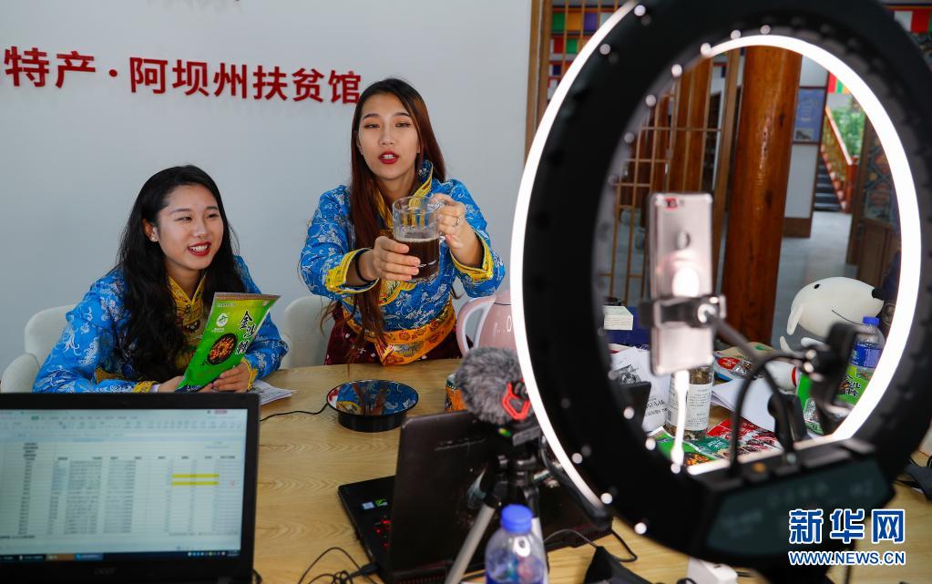 在四川省阿坝藏族羌族自治州松潘县的“中国特产·阿坝州扶贫馆”里,两名来自成都的网络主播通过京东直播平台,帮助松潘当地企业直播销售沙棘饮料等特产(2020年6月17日摄)。新华社记者 沈伯韩 摄