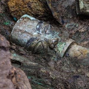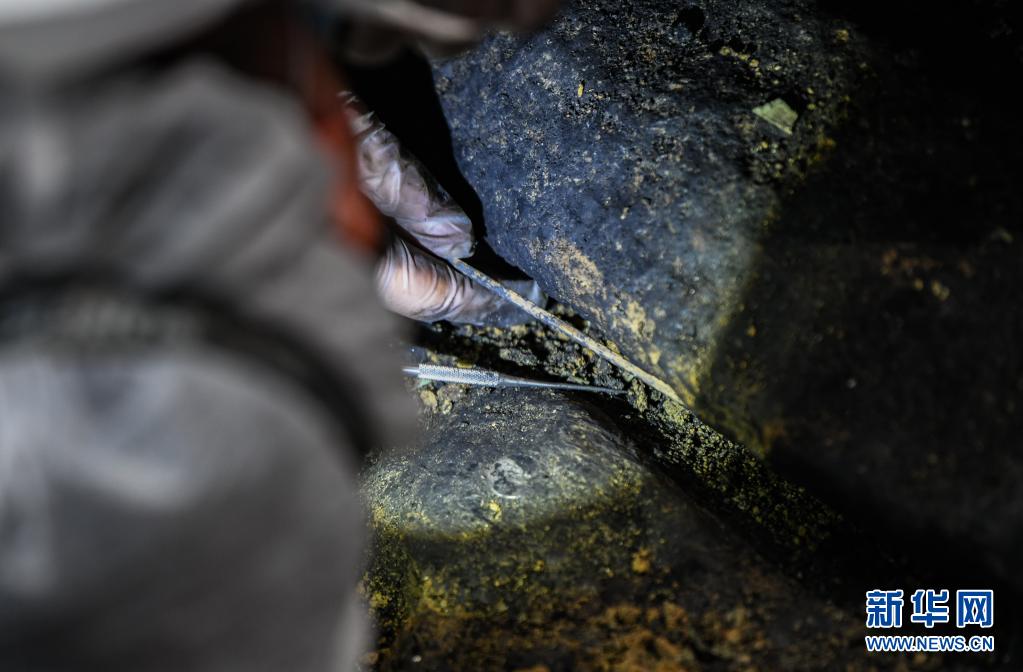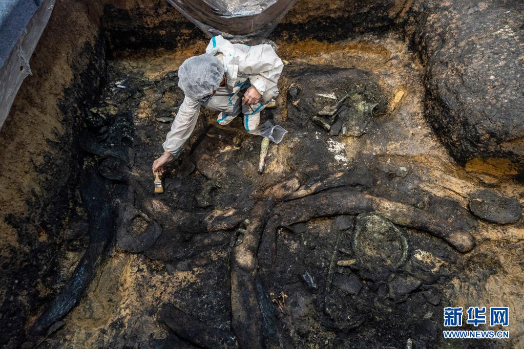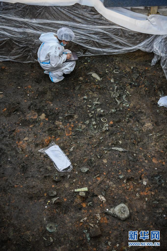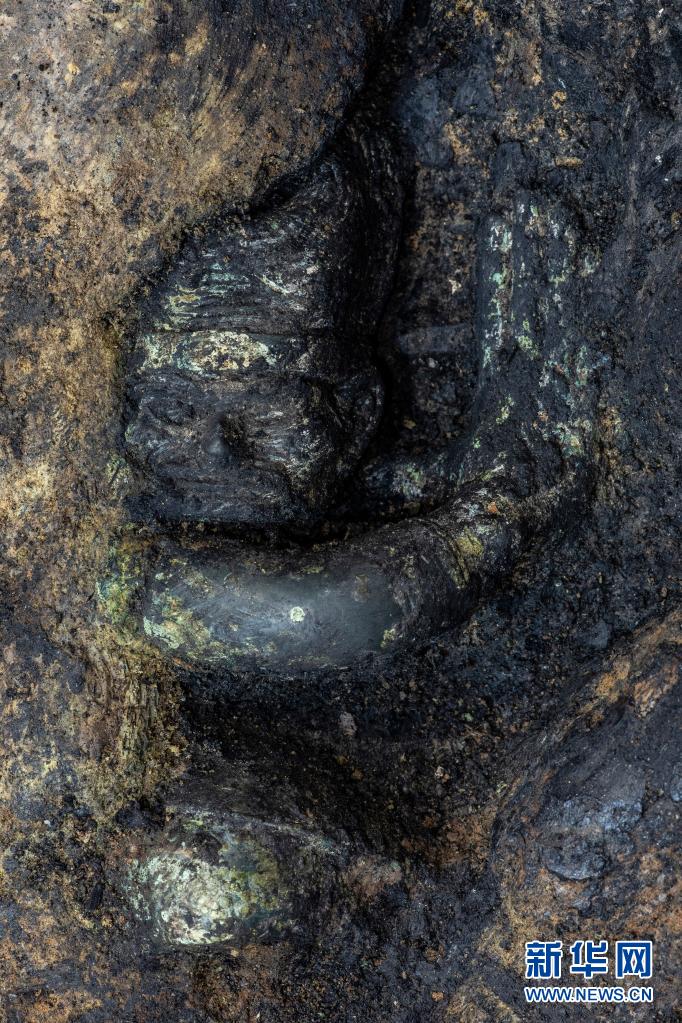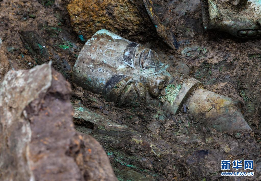 这是在三星堆考古发掘现场3号“祭祀坑”中新发现的青铜器(5月26日摄)。新华社记者 刘梦琪 摄