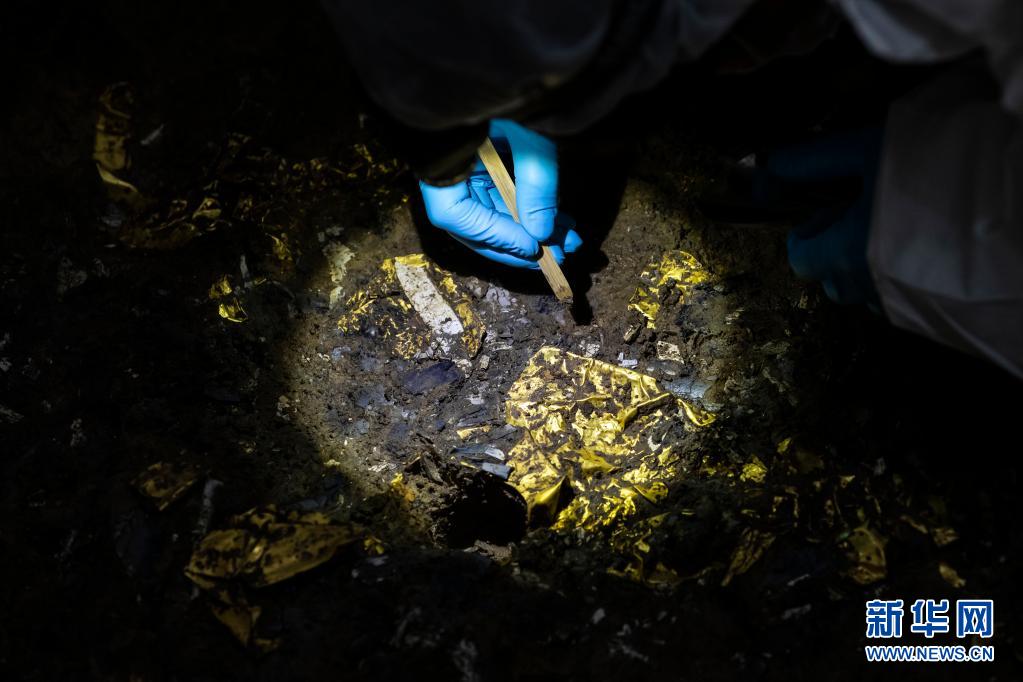 在三星堆考古发掘现场5号“祭祀坑”中,考古人员清理新发现的金面具残片(3月1日摄)。新华社记者 沈伯韩 摄