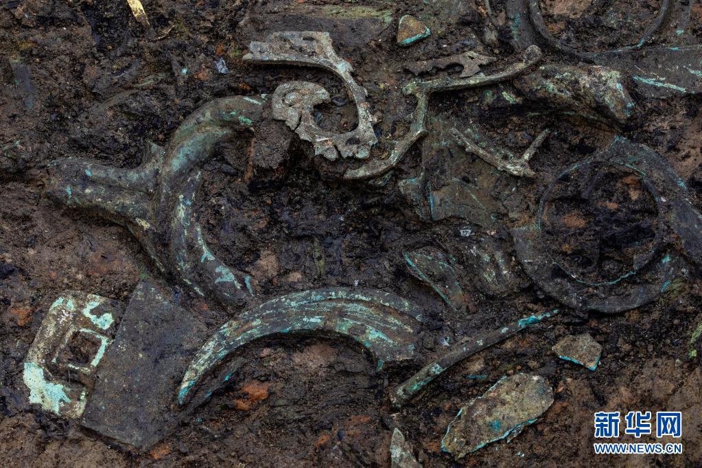 三星堆考古发掘现场3号“祭祀坑”中新发现的青铜器(5月26日摄)。新华社记者 刘梦琪 摄