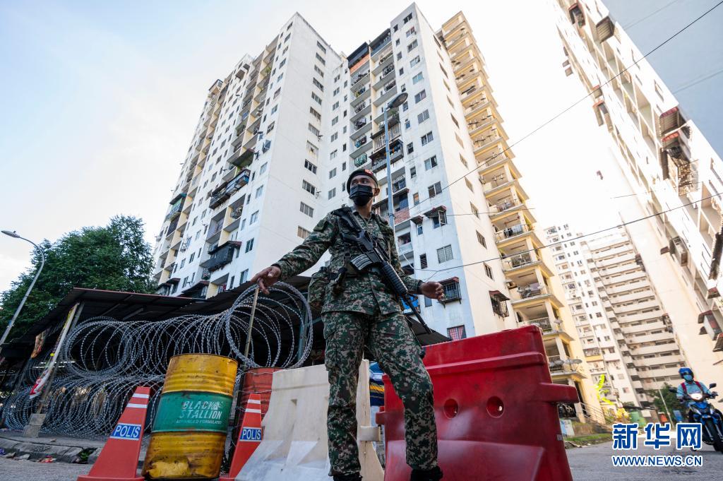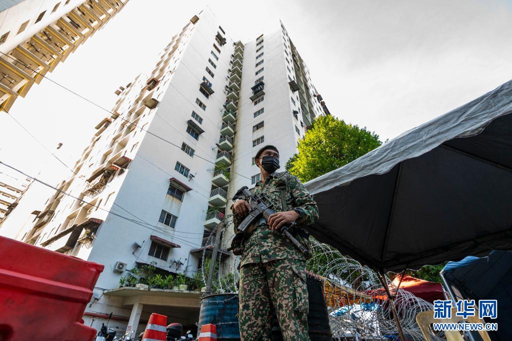 5月28日,士兵在马来西亚吉隆坡市郊一处因新冠疫情被封锁的小区执勤。新华社发(张纹综 摄)