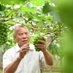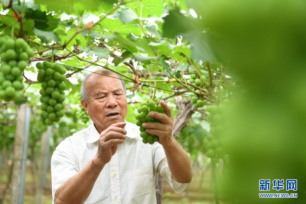 5月27日,在位于福建南平市建阳区的南平市武夷葡萄园艺研究所,人称“葡萄痴”的科技特派员谢福鑫在观察葡萄新品种的长势。