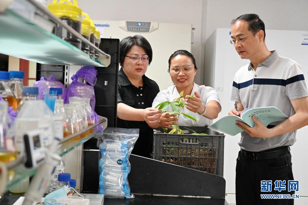 5月29日,扎根南平市光泽县多年的福建省农业科学院的科技特派员苏海兰(中)与团队成员在省农科院实验室研究基质对七叶一枝花根系生长的影响。